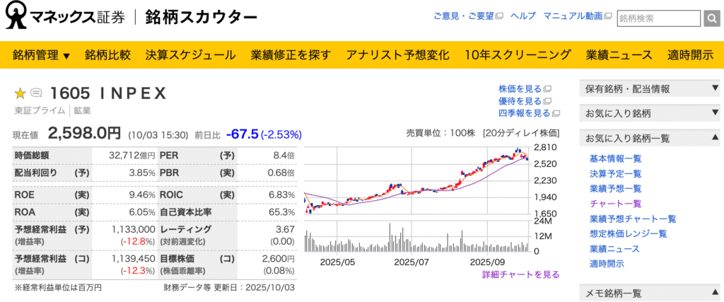 マネックス証券より一例として、原油・ガス開発生産国内最大手の銘柄:INPEXをみてみました。PBRの値が0.68となっている事が分かります。