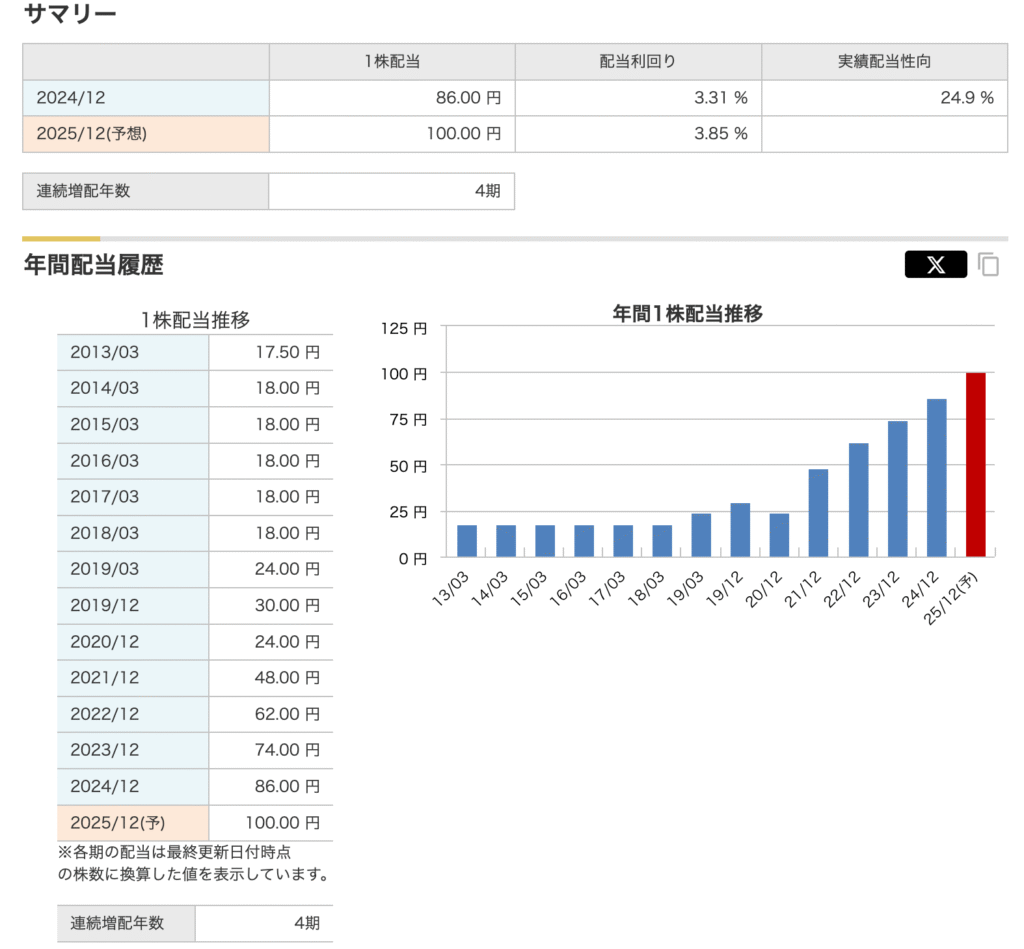 下の図のように、実績配当性向の数字では健全でバランスの取れた利益還元が出来ている事が分かります。配当推移のグラフは右肩上がりで伸びているのも見れます。